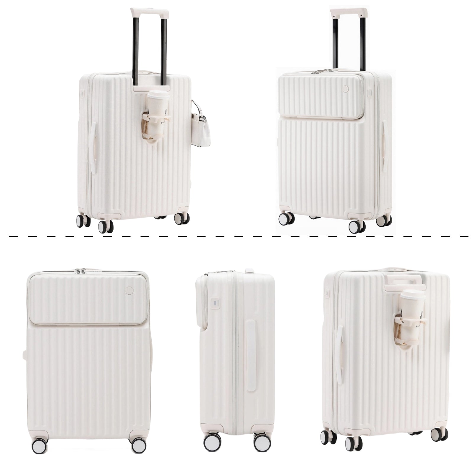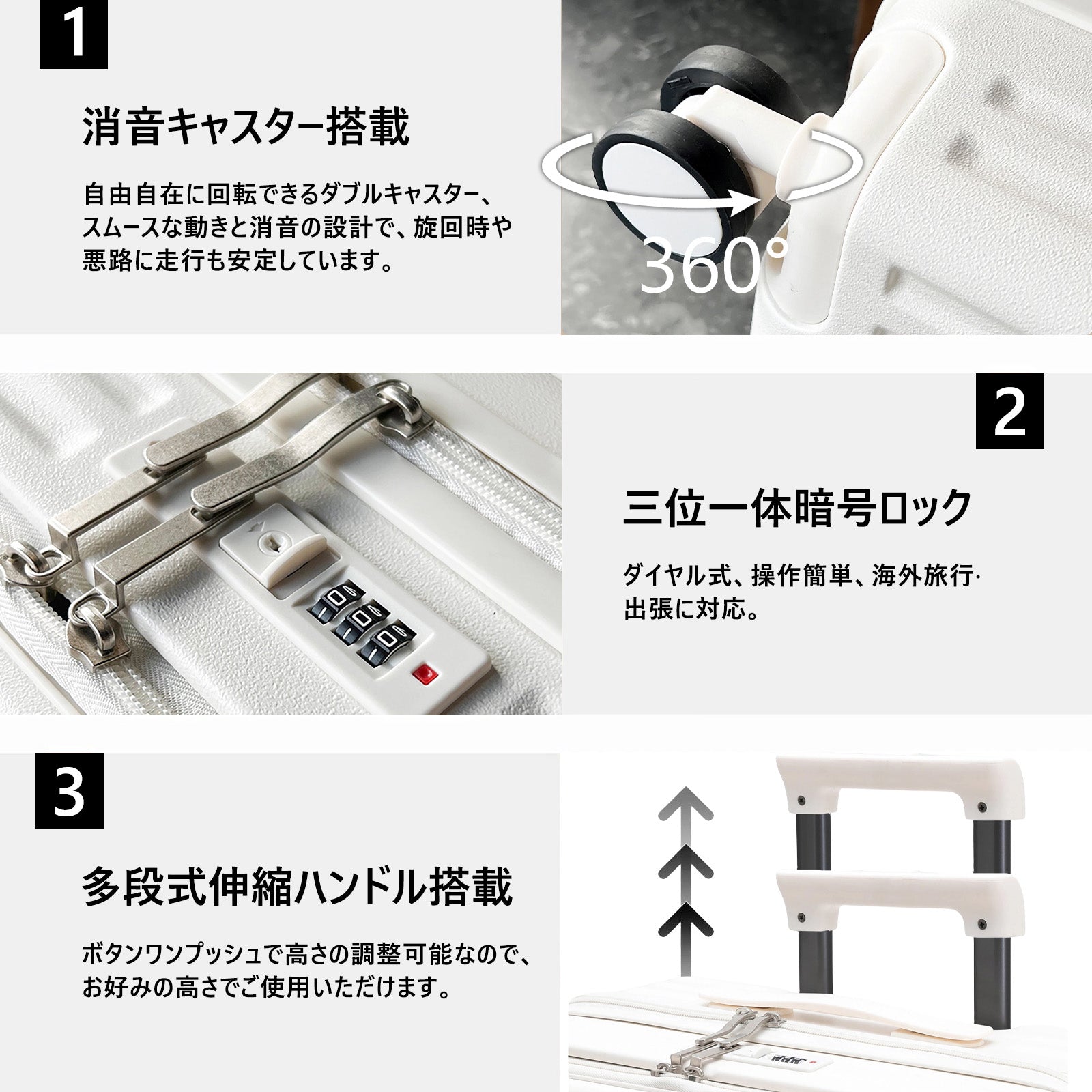 - ◆【使い勝手の良い収納スペース】このスーツケースは、フロントオープン部とメイン部の二つの区域で構成されています。①フロントオープン部には、ジッパー付きメッシュポケットとPC用ポケットを備え、必要な物をすぐに取り出せます。②メイン部には、荷物の移動を防ぐX字ベルト固定スペース、ジッパー付きポケット、メッシュポケット、乾湿分離ポケットを装備。荷物の整理が簡単で、スーツケースを開かずに素早くアクセス可能。出張から旅行まで、あらゆるシーンに対応します。