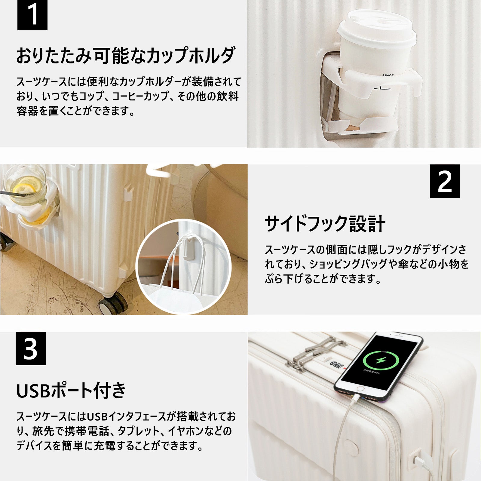 - ◆【USB充電ポート付き】スーツケースにモバイルバッテリーを収納するポケットがついており、USBポートの充電口が外にあることで、いつでもどこでも充電できます。また、充電ポートには防水カバーが付いているので、雨の日の外出でも水滴がつく心配がありません。揺れない、使用する場所を選ばない、使い勝手の良さが魅力です。