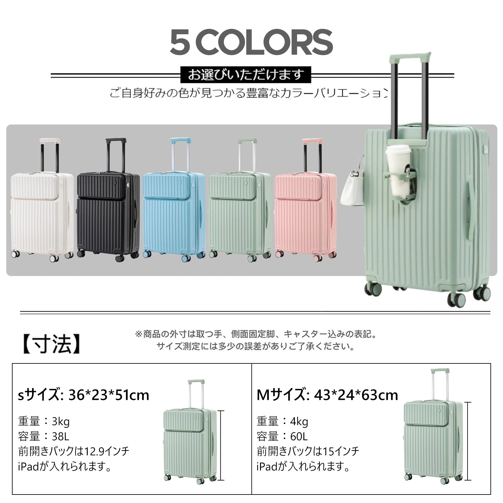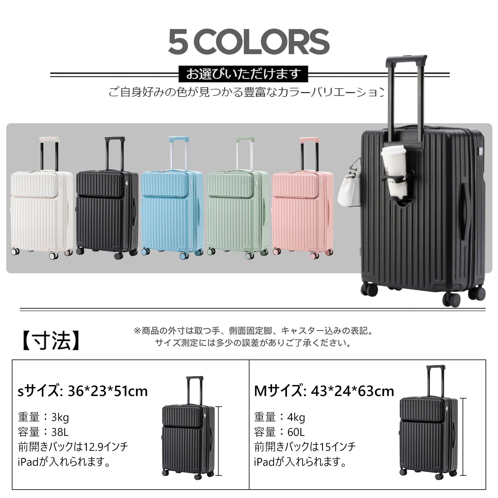 - ◆【寸法情報】Sサイズ:全体外寸36cm x 23cm x 51cm 本体重量:約3kg 容量:約38L(1~3泊対応)。Sサイズは 機内持込みが可能な 『 3辺合計115㎝以内 』の基準を満たしています。(座席数100席以上の航空機の基準です)。Mサイズ :全体外寸43cm x 24cm x 63cm 本体重量:約4kg 容量:約60L(3~7泊対応)。※商品の外寸は取つ手、側面固定脚、キャスター込みの表記。サイズ測定には多少の誤差がありご了承ください。