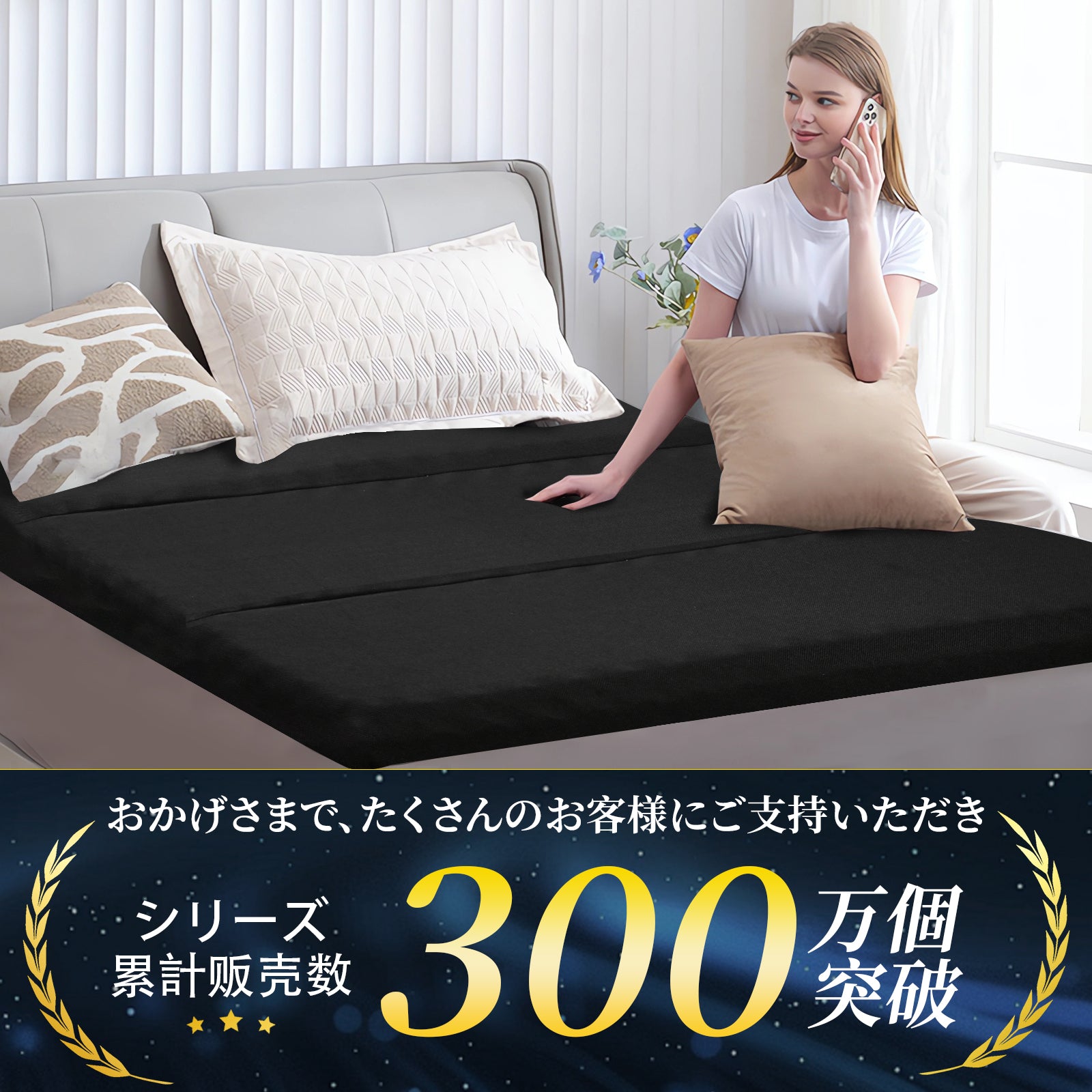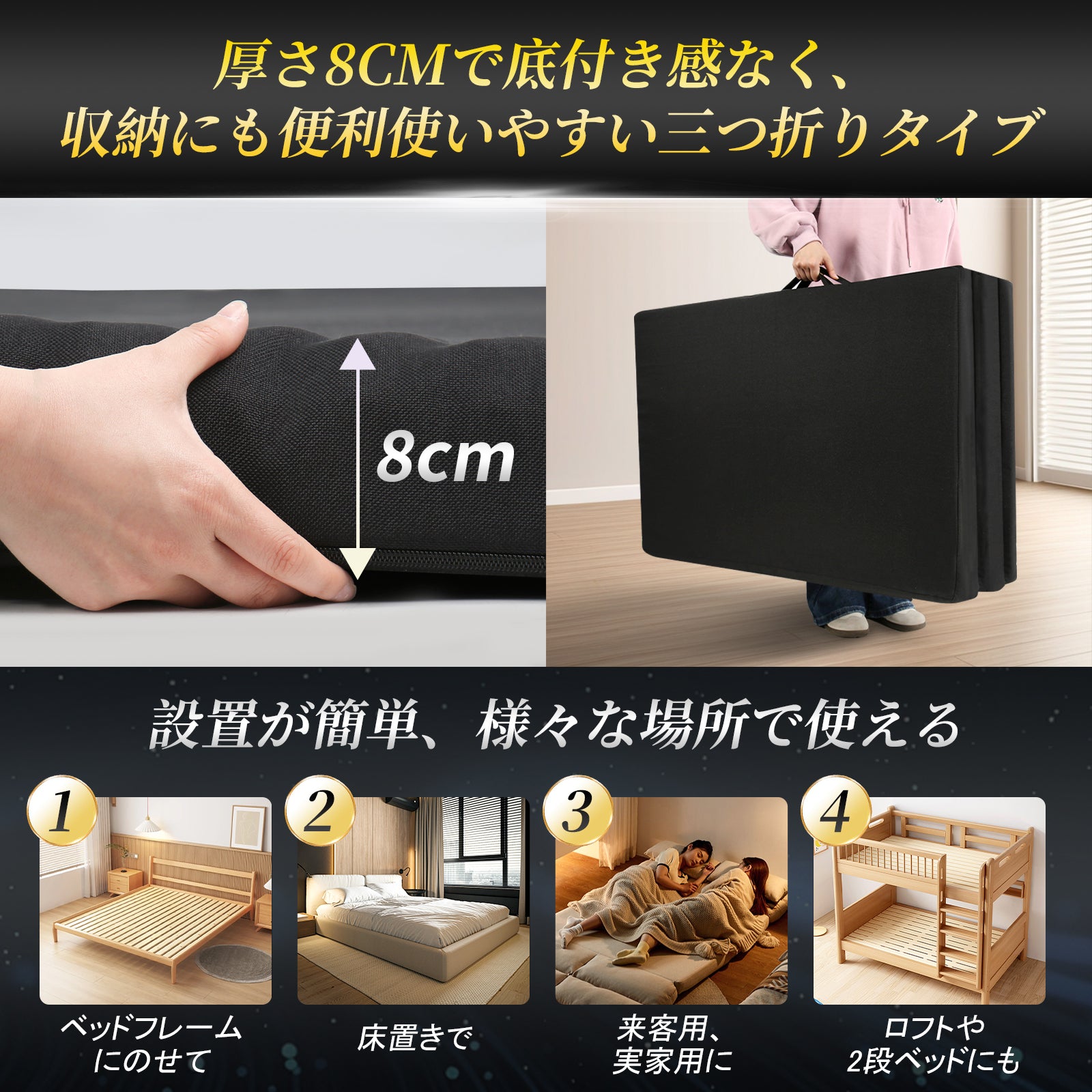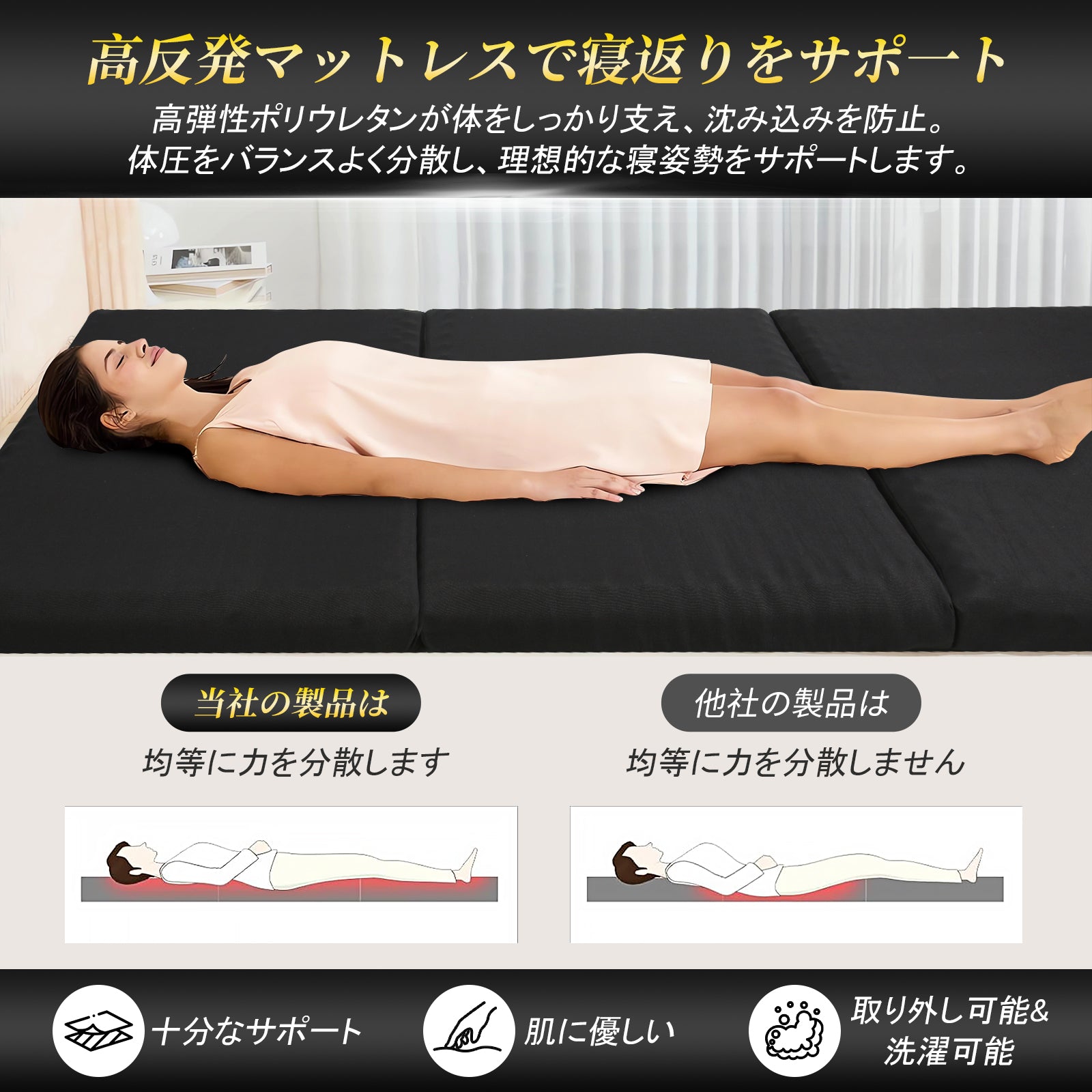 【三つ折りデザインで簡単収納と持ち運び】 このマットレスは、使わない時には簡単に三つ折りにしてコンパクトに収納できます。旅行やお客様用に便利で、収納スペースを節約できます。さらに、軽量設計なので、持ち運びも簡単です。広げるだけで即使用可能で、寝心地を損なうことなく快適に眠れます。また、取り外し可能なカバーは水洗い可能で、常に清潔な状態を保つことができます。