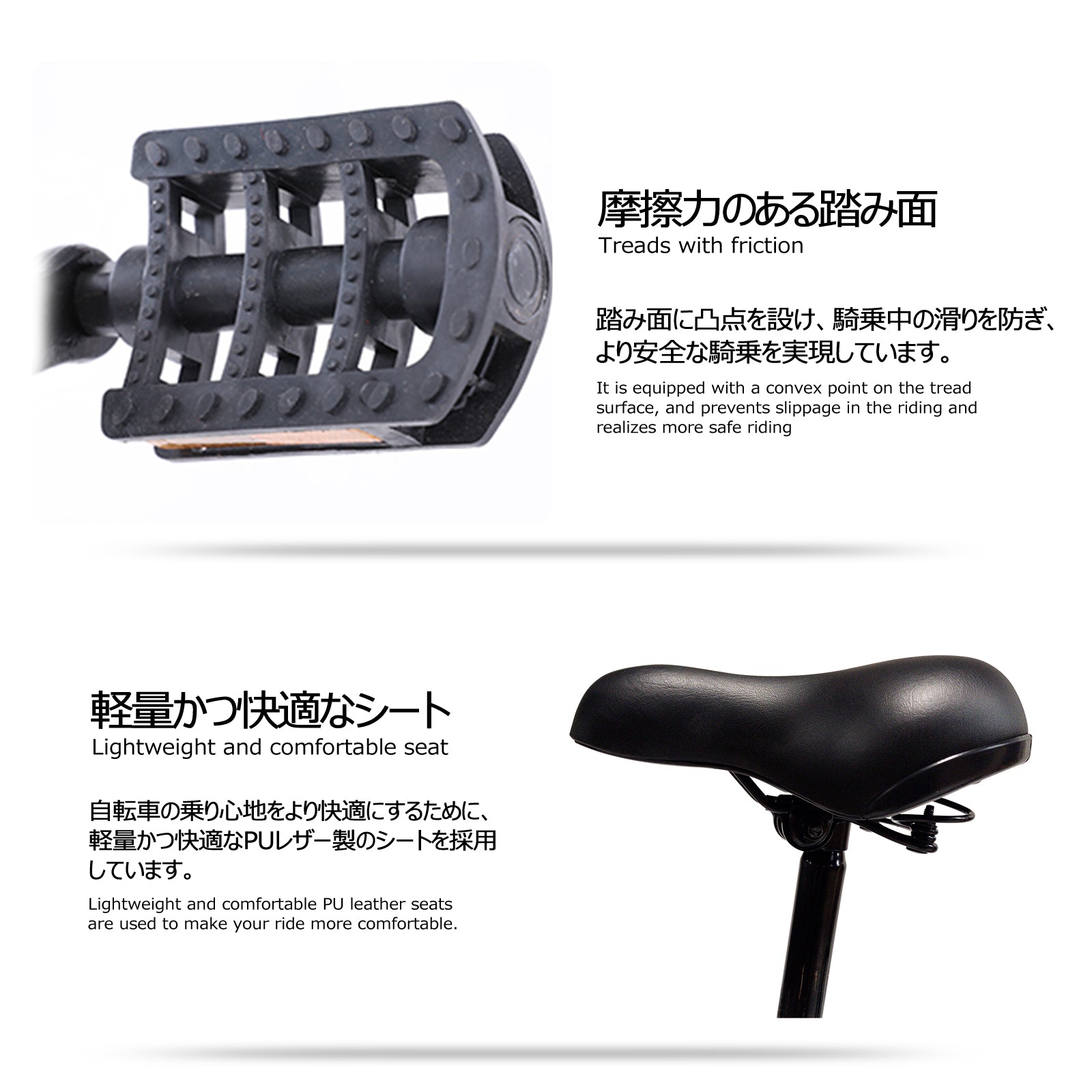 - 優れた安定デザイン:自転車は、高炭素鋼フレームを使用しており、100キロの重さに耐える頑丈さを誇ります。この頑丈なフレームは、安定性と長寿命を提供し、日常の使用やさまざまな地形での乗り物としての要求にしっかりと応えます。安全性と快適性を重視して設計され、信頼性の高い乗り物として安心してご利用いただけます。