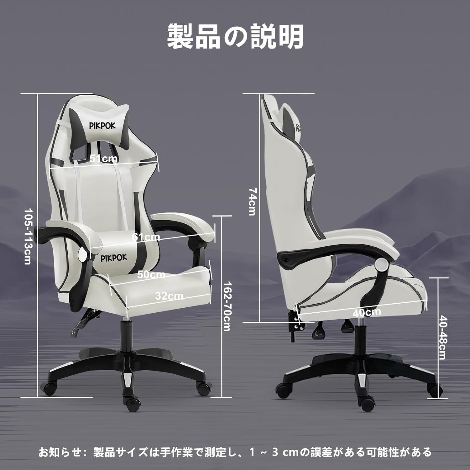 - 簡単に組立可能・商品仕様: ゲーミングチェアのサイズ:幅62×奥行49×高さ105-113cm(座面高:40-48cm)。高さ調節が可能なので、小柄な女性にも座りやすいモデルとなります。また、本体重量は15kgですが、静止耐荷重は約100KGに達しており、ご安心して利用いただけます。組み立てには、道具も日本語説明書も付いていますから誰でも20分以内に八つのシンプルステップでこのオフィスチェアを組み立てることができます。